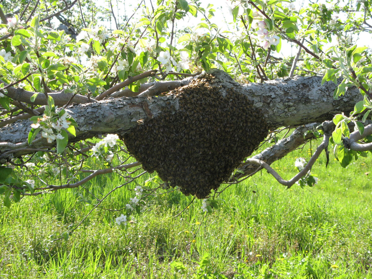Strong hives are known to issue swarms such as this one in an apple tree. Since swarms generally settle in a location well within foraging distance of the farm they came from, the loss of foraging force and its impact on pollination efficiency is slight and not a cause for concern. Swarms tend to be more of a problem for the beekeeper rather than the grower.